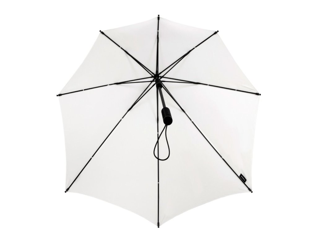 Aerodynamický dáždnik so širokou zadnou stranou pre maximálnu ochranu pred dažďom, čierna tyč, rám zo sklenených vlákien so zosilnenými kĺbmi, čierna rukoväť, s ochranným puzdrom.
