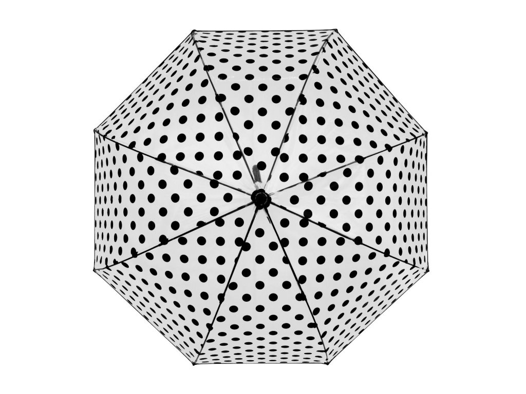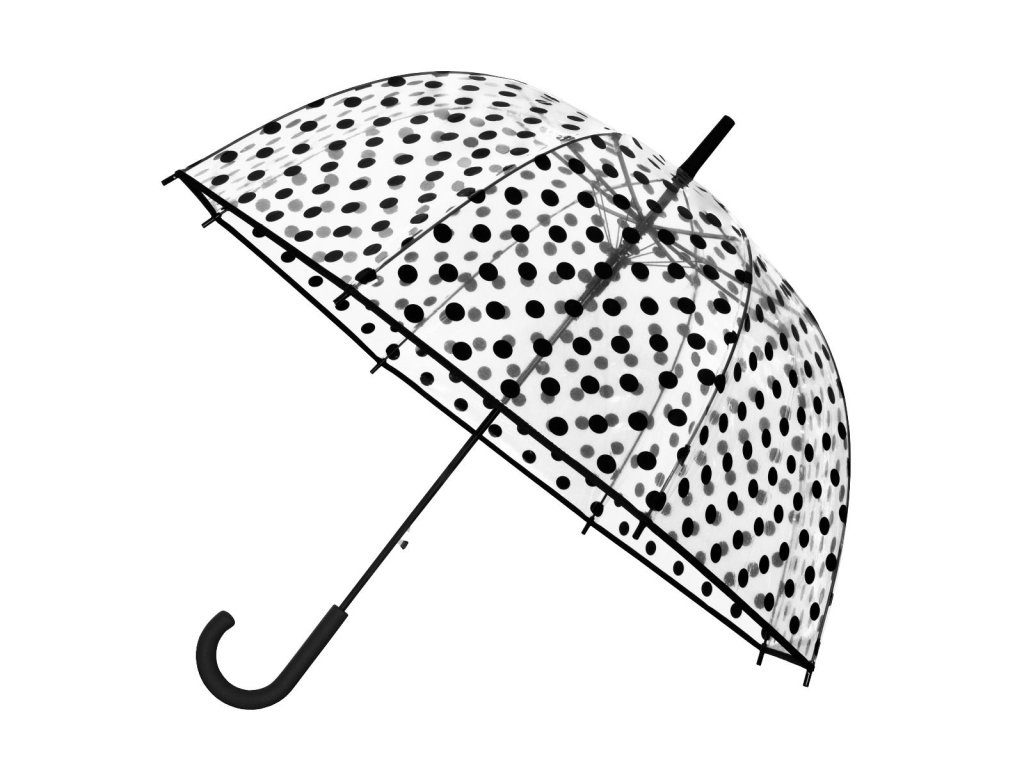 Palicový priesvitný dáždnik Impliva Falconetti LA-28, rebrá z čierneho kovu/sklolaminátu, 8 mm čierna kovová tyč, priehľadný polyesterový materiál s bodkovým dizajnom, čierna plastová rukoväť a hroty.